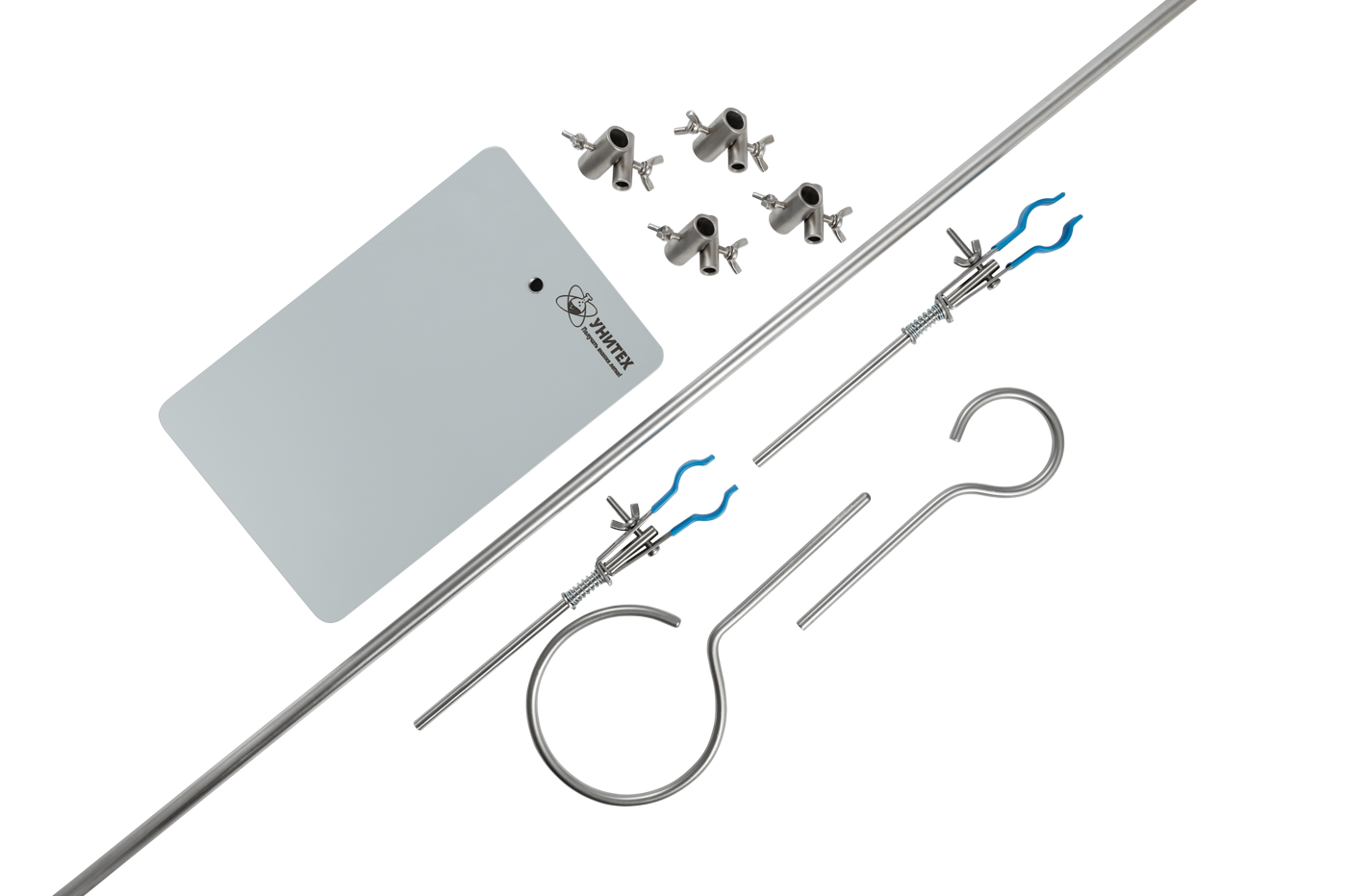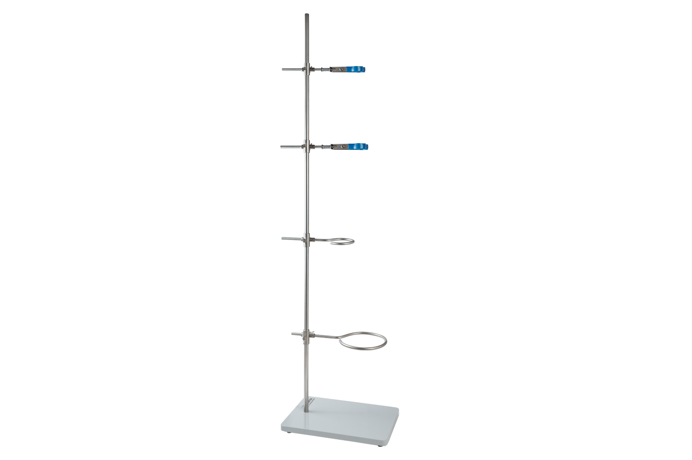 Штатив лабораторный химический комплектуется двумя лапками, двумя разрезными кольцами и тремя муфтами. Все элементы штатива выполнены из нержавеющей стали.
