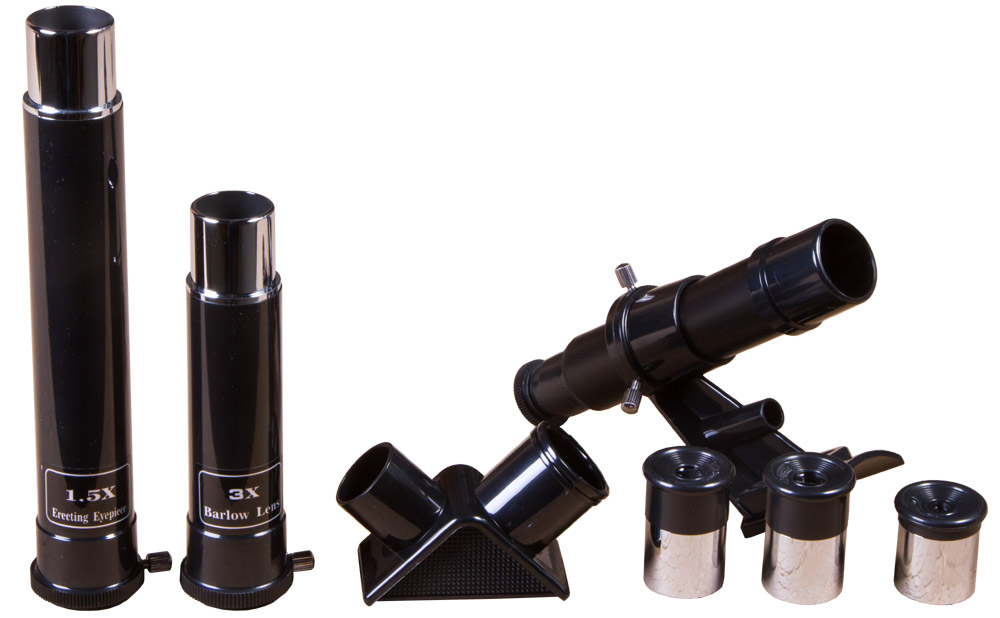 В комплект поставки включены несколько окуляров и линза Барлоу. Еще один аксессуар, диагональное зеркало, необходимо для наземных наблюдений. Оно позволяет видеть окружающий мир в привычной ориентации (верх и низ изображения на своих местах) – телескопы переворачивают картинку с ног на голову, и диагональное зеркало это исправляет.