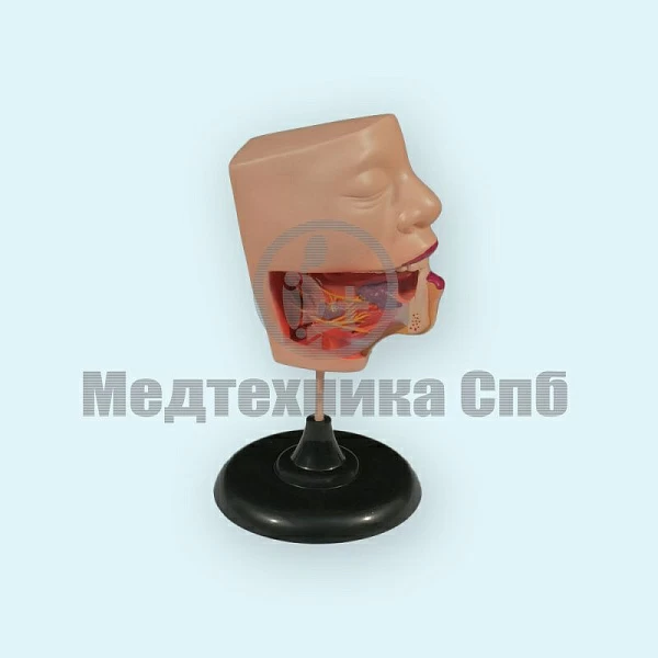 На модели представлены глубокие слои подчелюстного треугольника; мышцы, подчелюстные слюнные железы, язычный и подъязычный нервы.