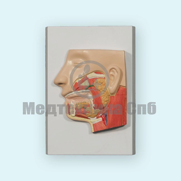 На модели представлены большие слюнные железы (околоушная, поднижнечелюстная и подъязычная). Для наглядности модели, кожа и левая половина нижней челюсти отсутствуют.