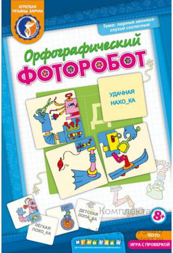 В наборе: 64 маленьких карточки со словами, в которых пропущены согласные, 16 больших карточек с парными звонкими/глухими согласными. Задача играющего - подобрать проверочное слово к словам на маленькой карточке и определить пропущенную букву. При правильном выполнении задания из маленьких карточек складывается забавный робот - он и служит проверкой! Детали, из которых получается робот, взаимозаменяемы: не важно, что одна нога у него с колесом, а другая - на роликах! Главное, руки и ноги на своем месте - значит, буквы тоже подобраны правильно. Вспоминай четыре слова на карточках. Вспомнил правильно - картинка засчитывается!