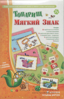 В нашей коробке - две разные игры. Объединяет их общая тема - написание слов с мягким знаком или без него. Лото - это 12 одинаковых карточек для 24-х существительных мужского и женского рода с шипящими на конце. Задача играющих - правильно определить род существительных и положить слово с пропущенным (или без него) мягким знаком. Как всегда, в наших играх существует проверка решений, что очень важно для юных игроков! При правильном выборе места для слова по краю карточки оно складывается при совмещении букв на картинке и на большой карточке. Смотри и запоминай!