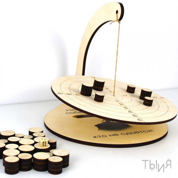 В комплект входит подставка-основание, специальная игровая доска на подвесе и набор брусочков. Игроки поочередно бросают кубик и кладут соответствующее выпавшему числу количество брусочков на доску, за каждый брусок начисляется то кол-в баллов, которое указано на игровом поле. Чем дальше от центра - тем сложнее, и тем больше баллов можно получить. Важно соблюдать баланс и не допускать опрокидывания игрового поля или падение брусочков.