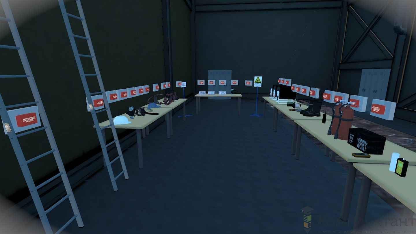 Виртуальный (VR) тренажер «Газоопасные работы» воссоздает ситуацию, в которой пользователь попадает в колодец глубиной 4 метра, где ему необходимо провести осмотр трубы, используя газоанализатор и противогаз, в условиях недостатка кислорода и наличия взрывопожароопасных загрязнителей в воздухе. В симуляции можно задать дополнительное условие: допуск с неполным комплектом.