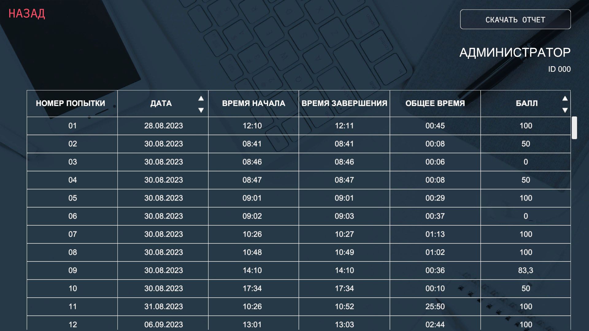 По завершении автоматически формируется отчет с указанием затраченного времени, правильных и неправильных ответов, количества набранных баллов.