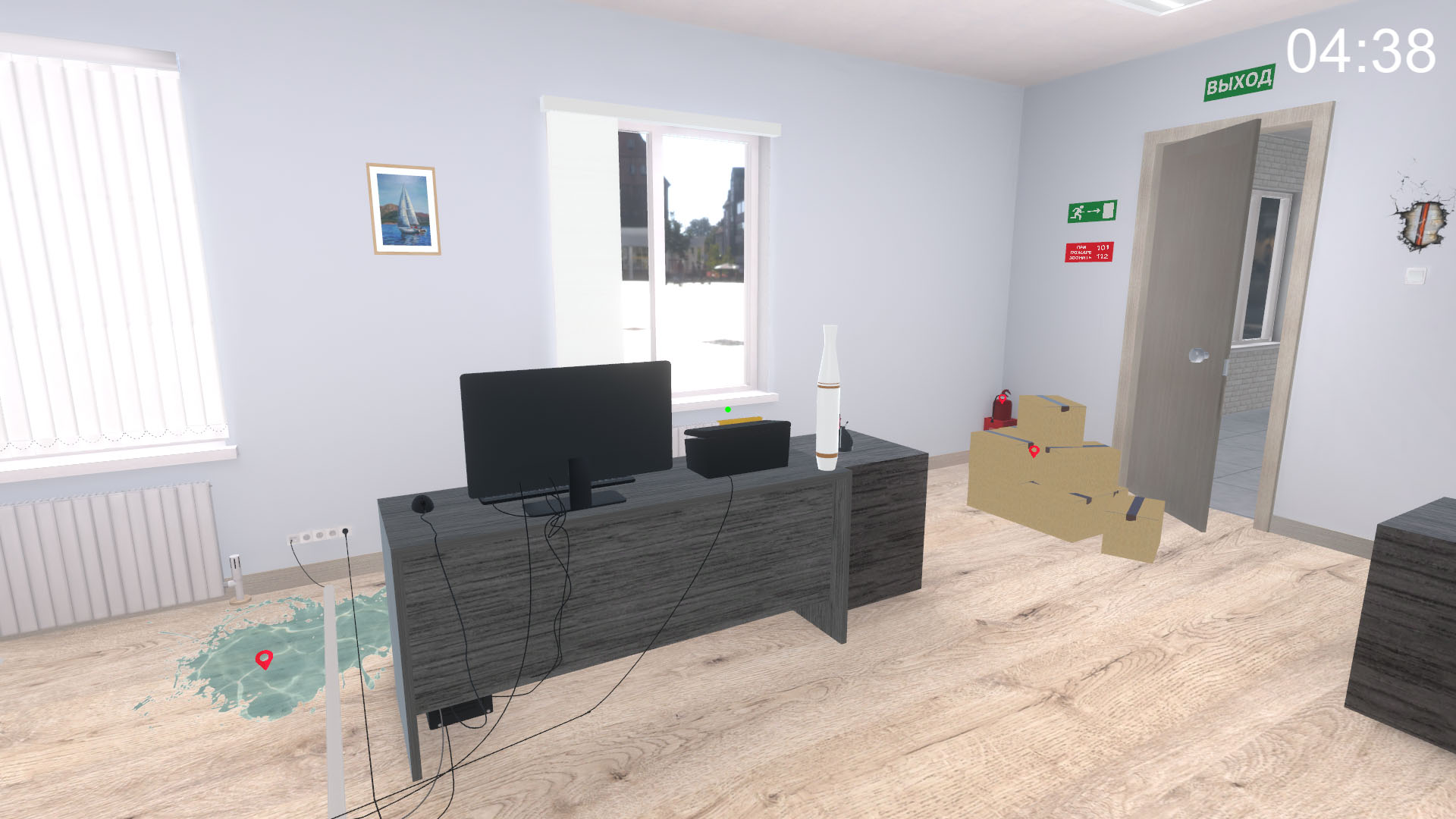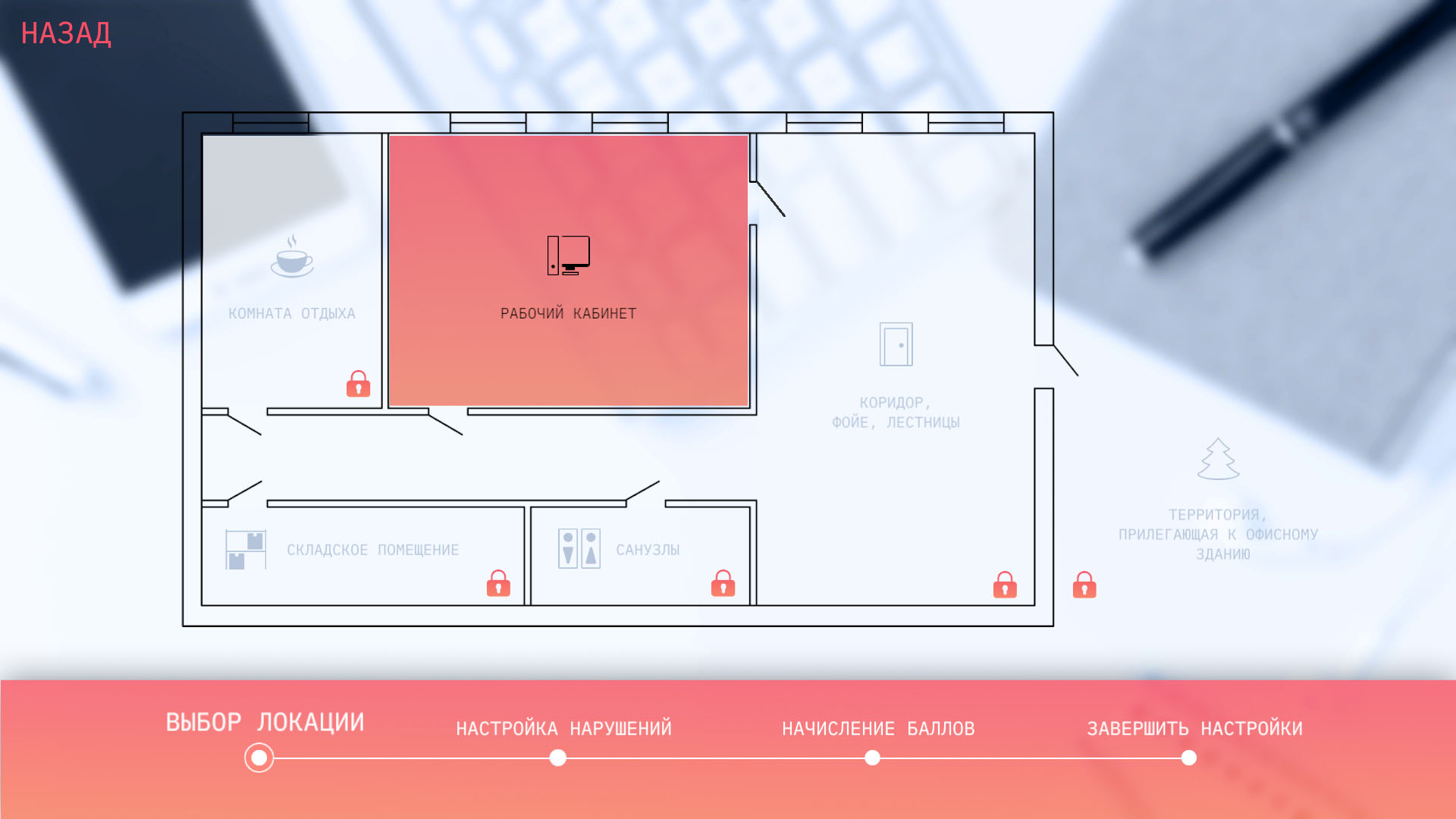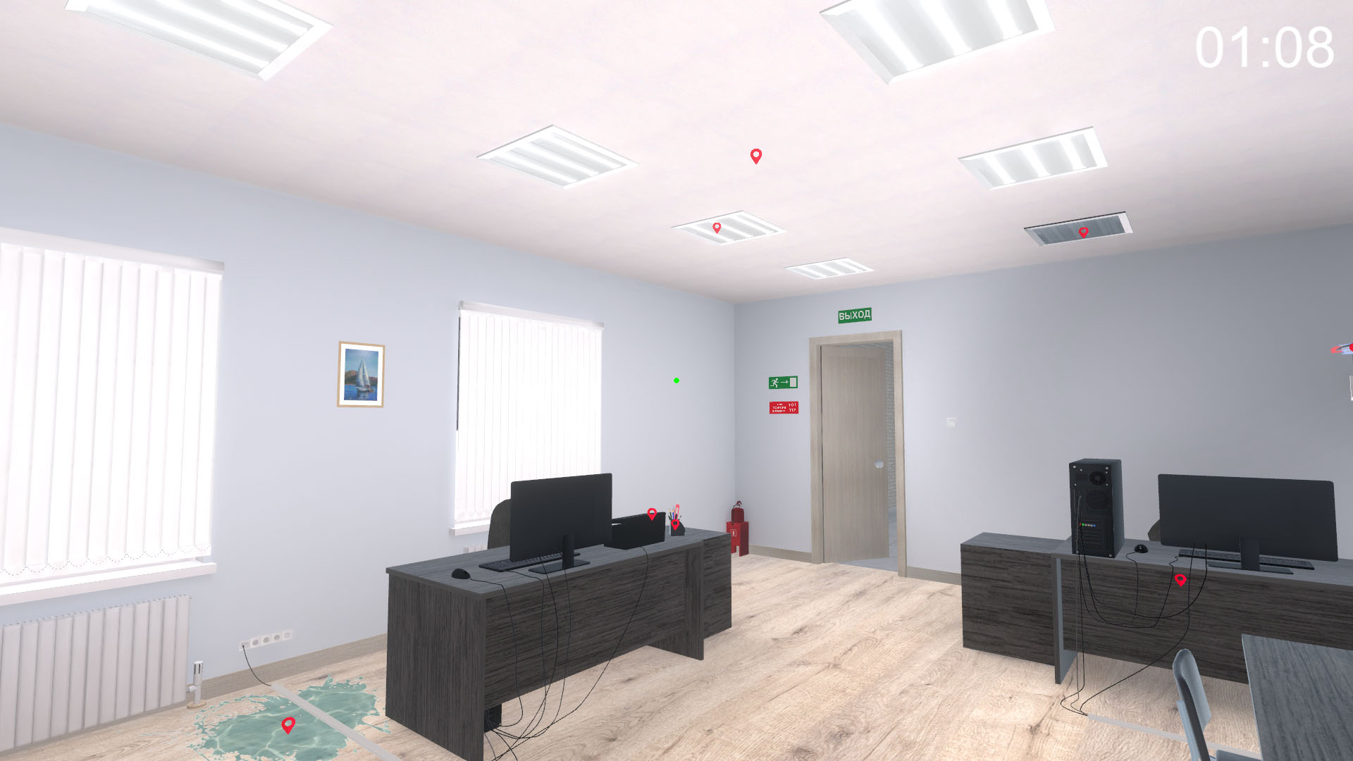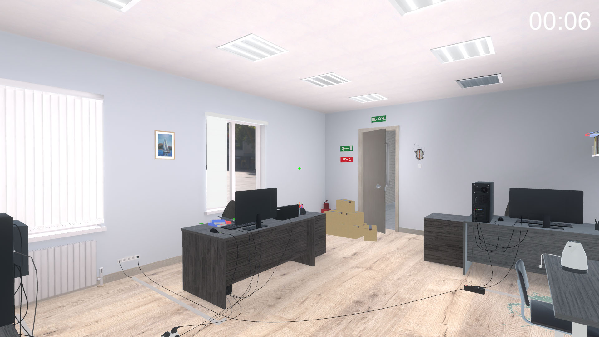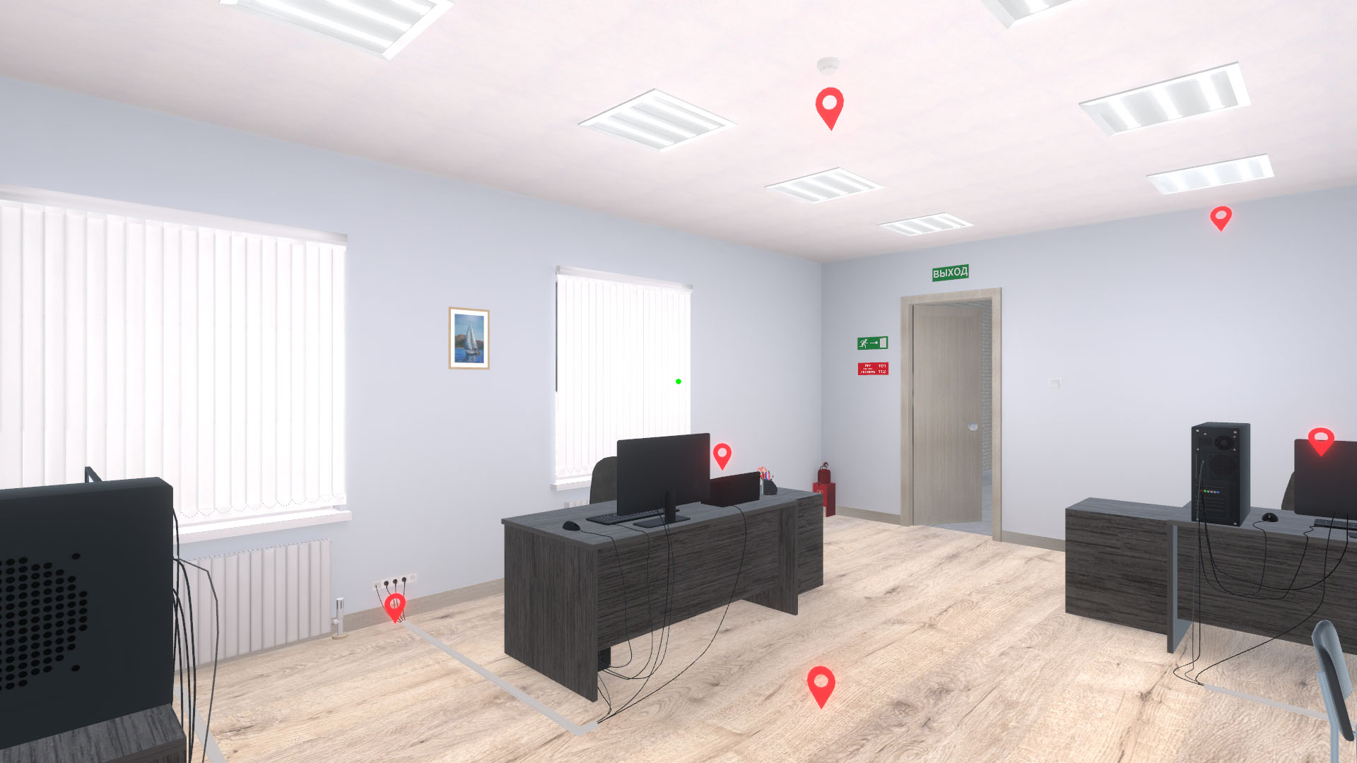 Тренажер включает одну локацию по умолчанию: рабочий кабинет. Дополнительные локации (комната отдыха, склад и др.) разрабатываются по запросу.