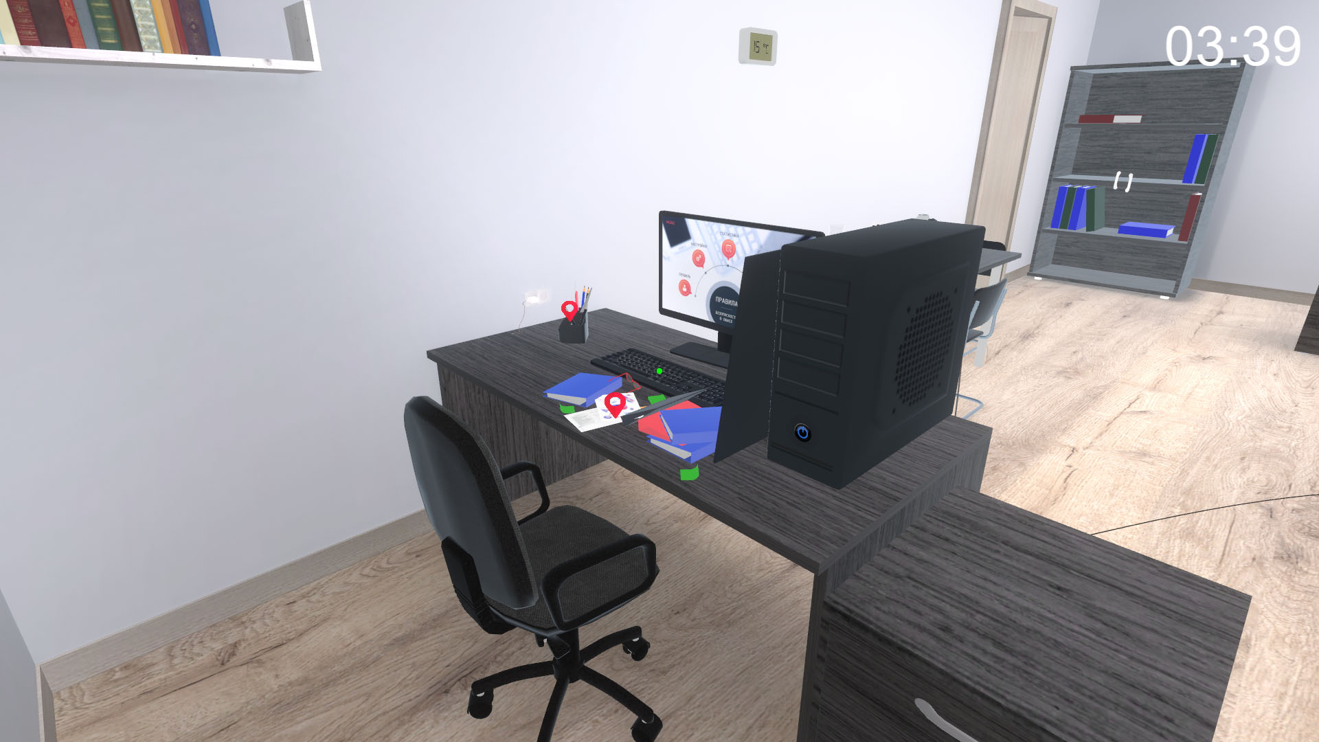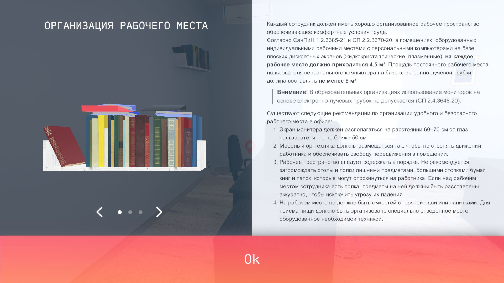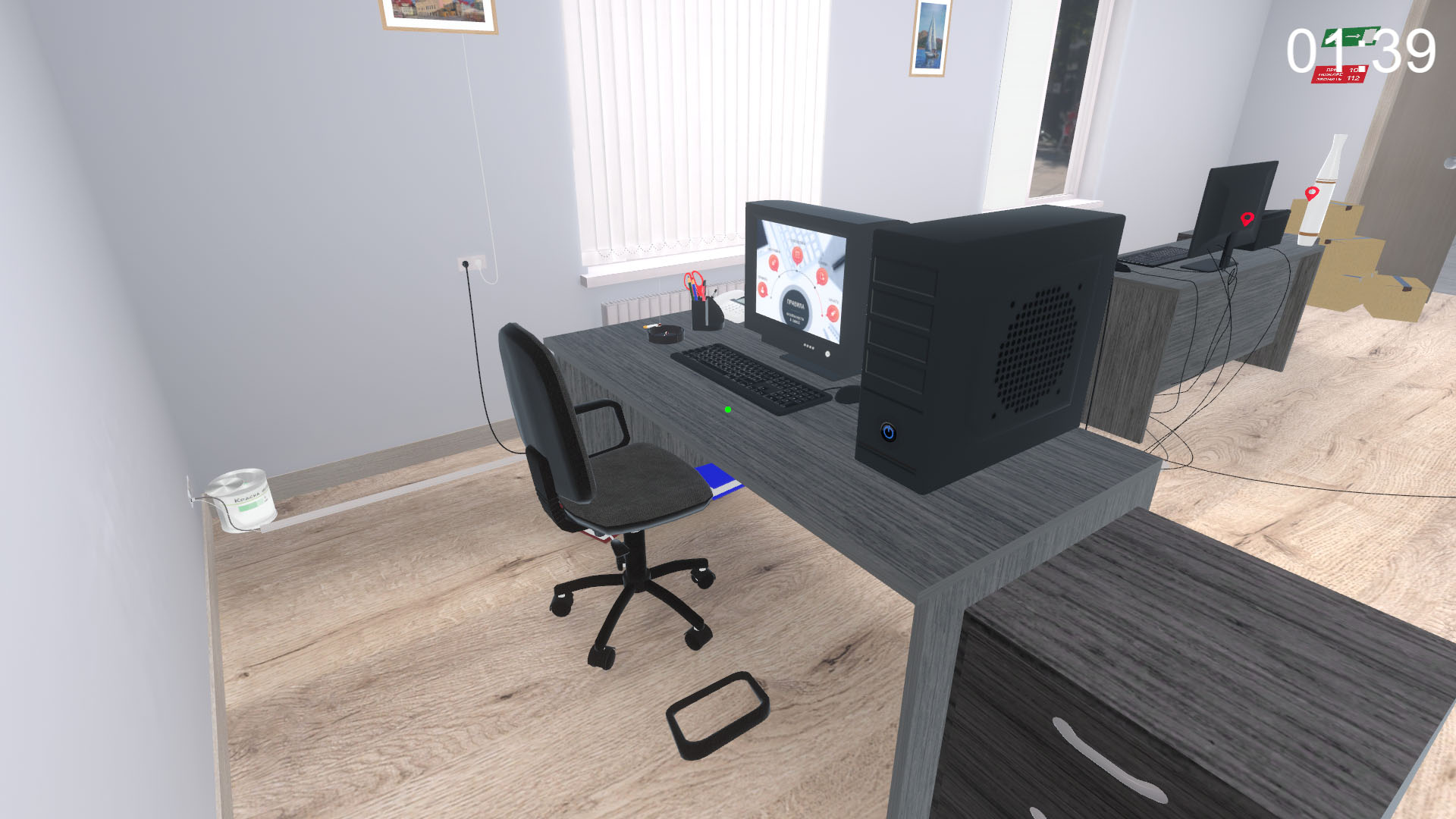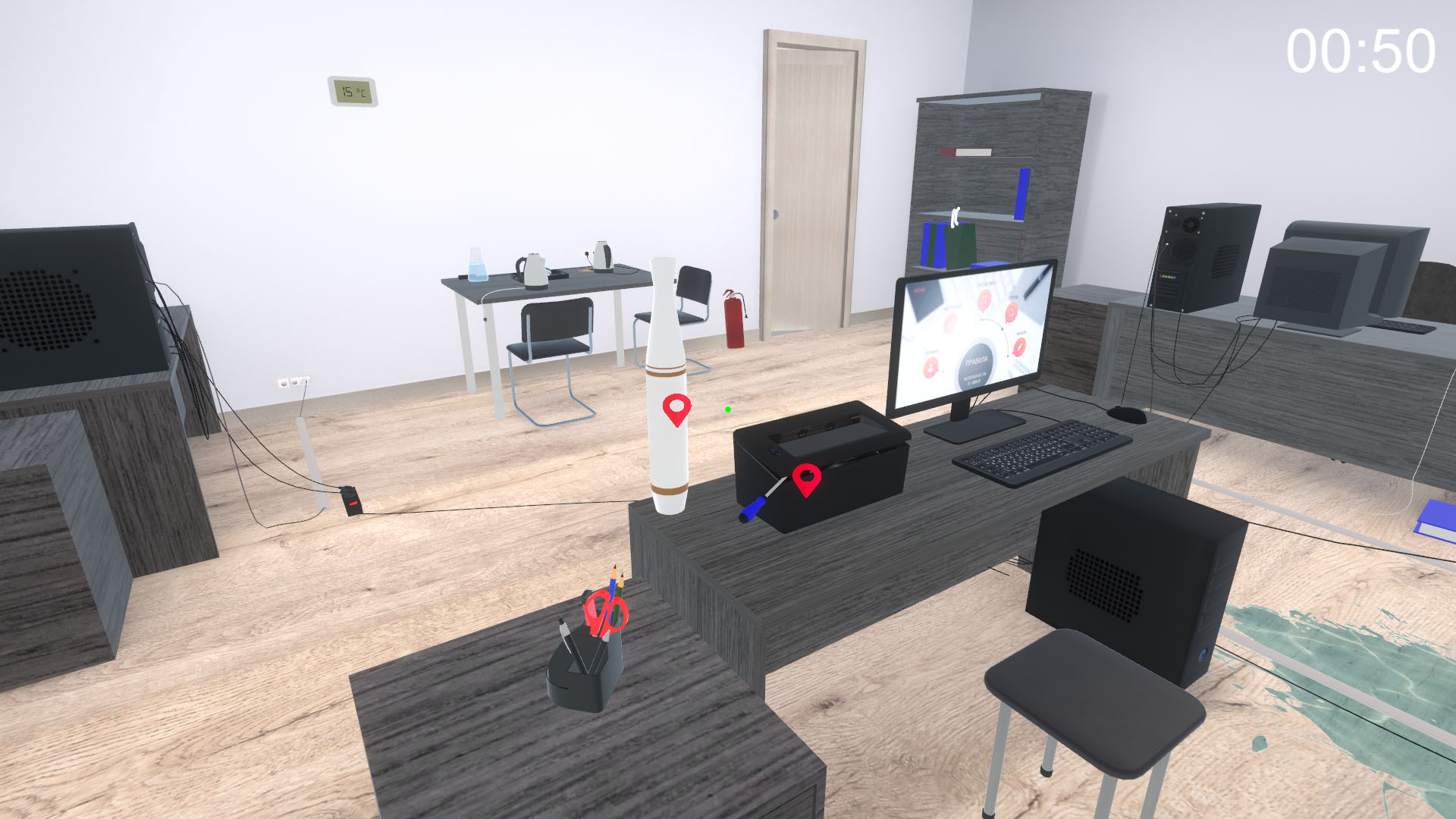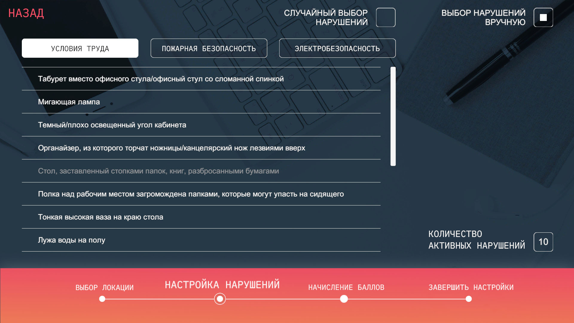 Тренажер включает одну локацию по умолчанию: рабочий кабинет. Дополнительные локации (комната отдыха, склад и др.) разрабатываются по запросу.