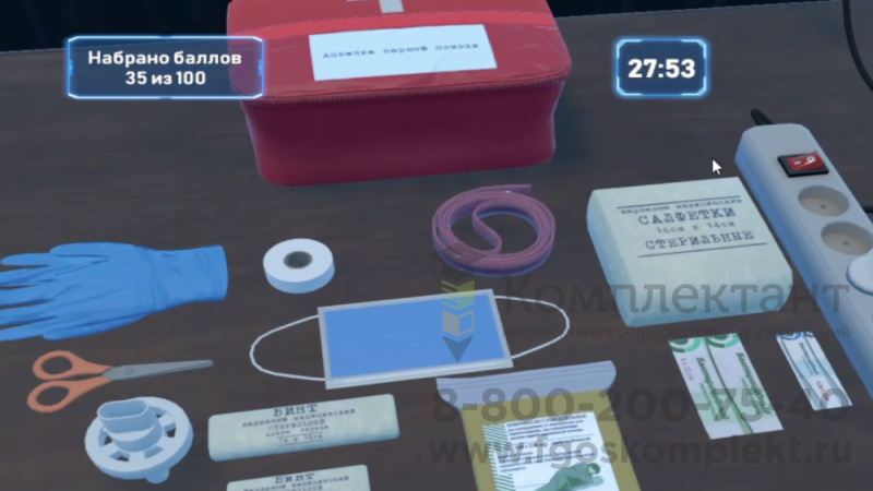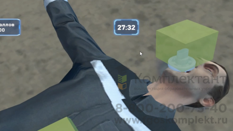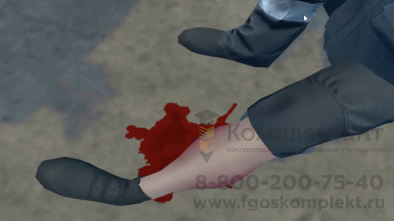 Тренажер воссоздает ситуацию, в которой пользователю необходимо оказать первую помощь товарищу, получившему травму. Вид травмы может быть разным: потеря сознания, ожог, кровотечение, обморожение, перелом.