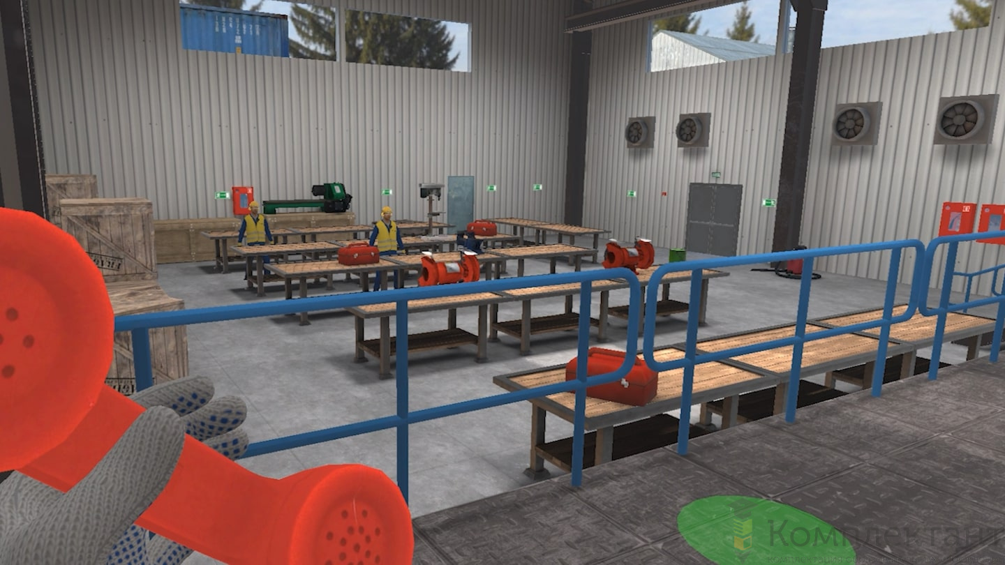 Виртуальный (VR) тренажер «Пожарная безопасность в цеху» воссоздает ситуацию возгорания в рабочем ангаре. Пользователю в процессе тренировки необходимо прекратить работу, вызвать пожарную охрану и, согласно плану, провести эвакуацию из ангара, а также применить огнетушитель.