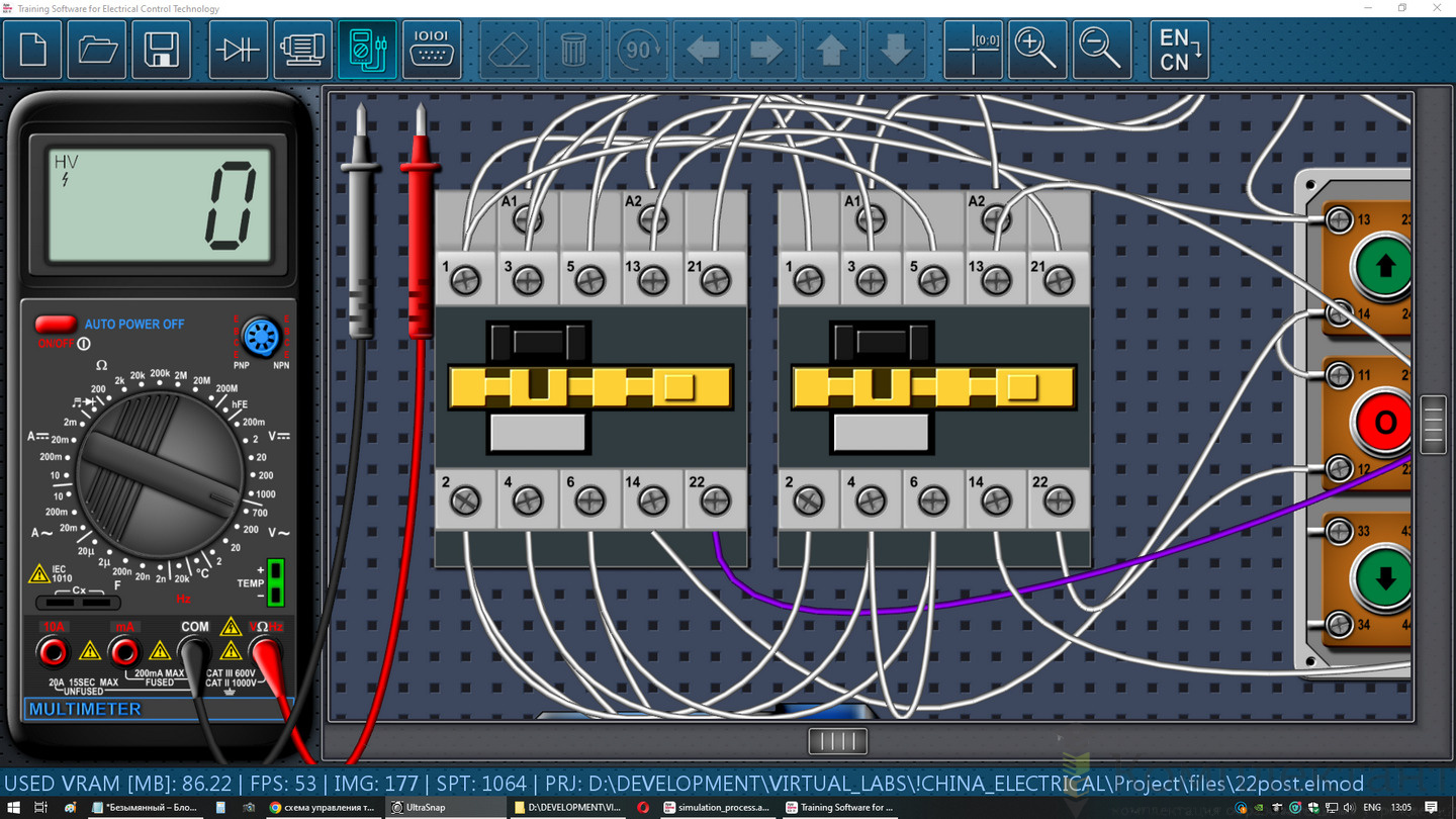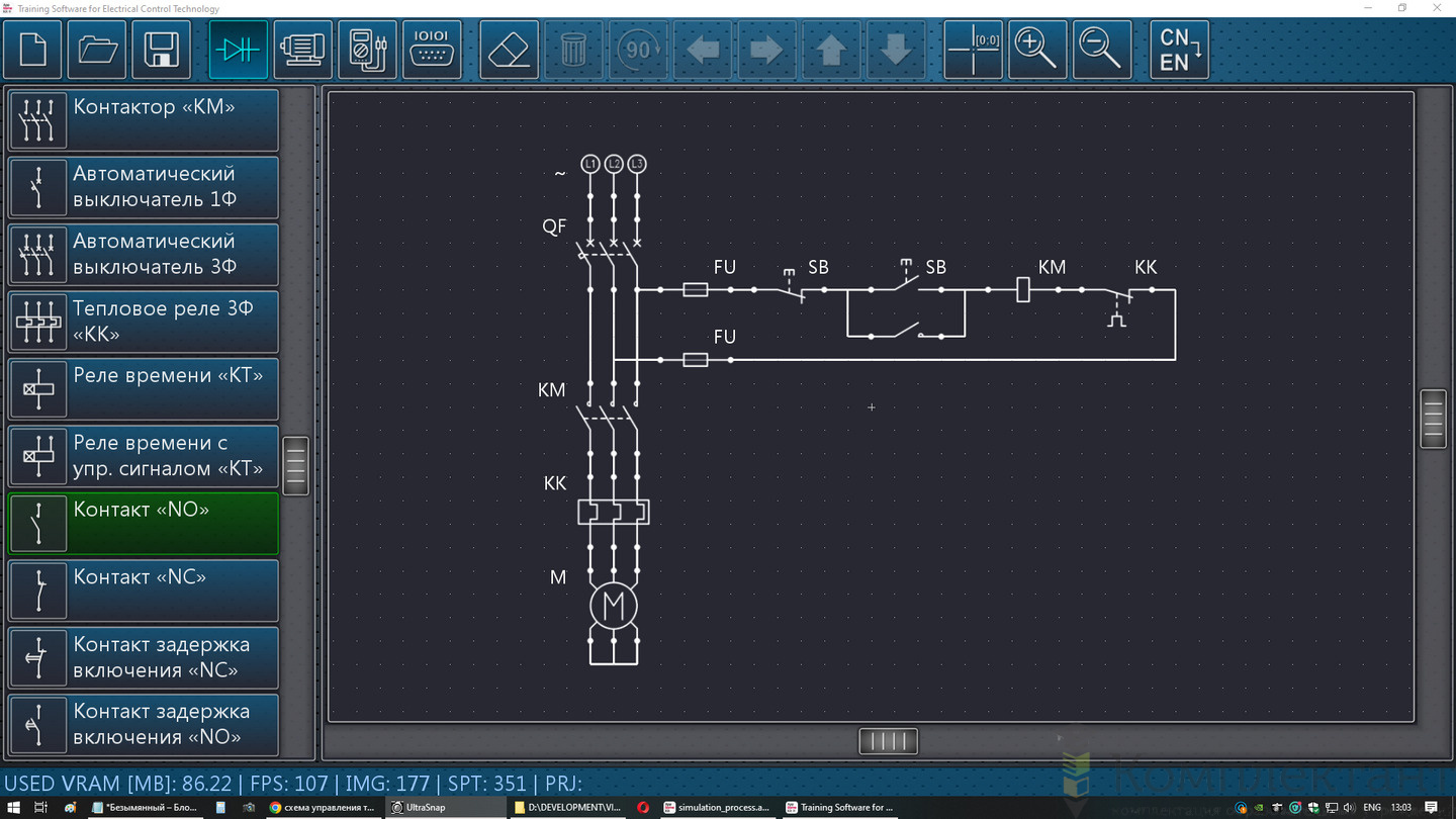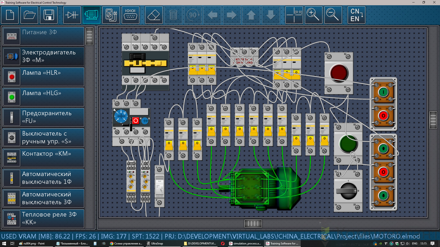 Имитационное обучение принципам построения релейно-контакторных схем управления трёхфазным асинхронным электроприводом с применением стандартных электрических компонентов – автоматических выключателей, контакторов, реле, кнопочных постов и др.
