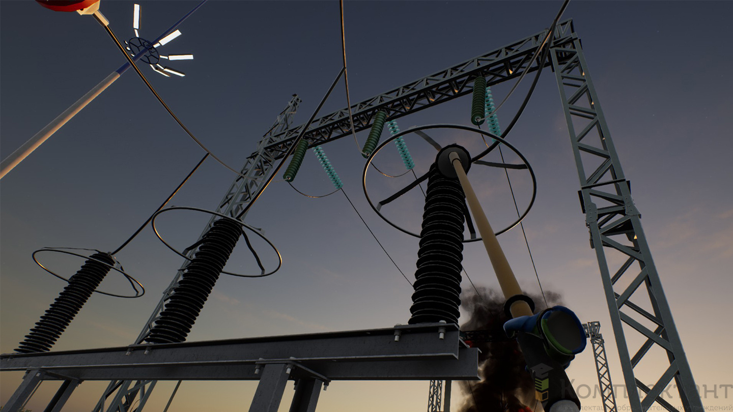 Виртуальный (VR) тренажер «Обслуживание силового трансформатора 110кВ» предназначен для формирования, закрепления (проверки) и поддержания профессиональных умений у работников электросетевых предприятий при выполнении работ согласно типовым технологическим картам, при действии обучаемого одиночно так и в составе ремонтной бригады с использованием виртуальной реальности в многопользовательском режиме, основанных на погружении обучаемого в приближенную к реальной ситуации виртуальную среду, обеспечивающей эффективное использование образной памяти обучаемого.