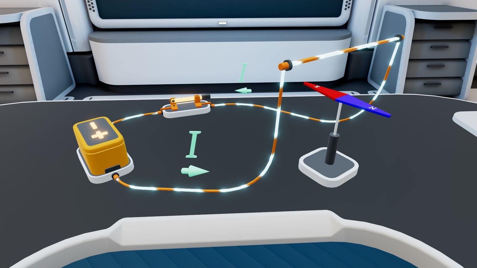 На столе электрическая цепь для проведения опыта Ампера. На старте исходное состояние проводников – последовательное подключение. На полке инструментов стрелки сил и руки для применения правила.