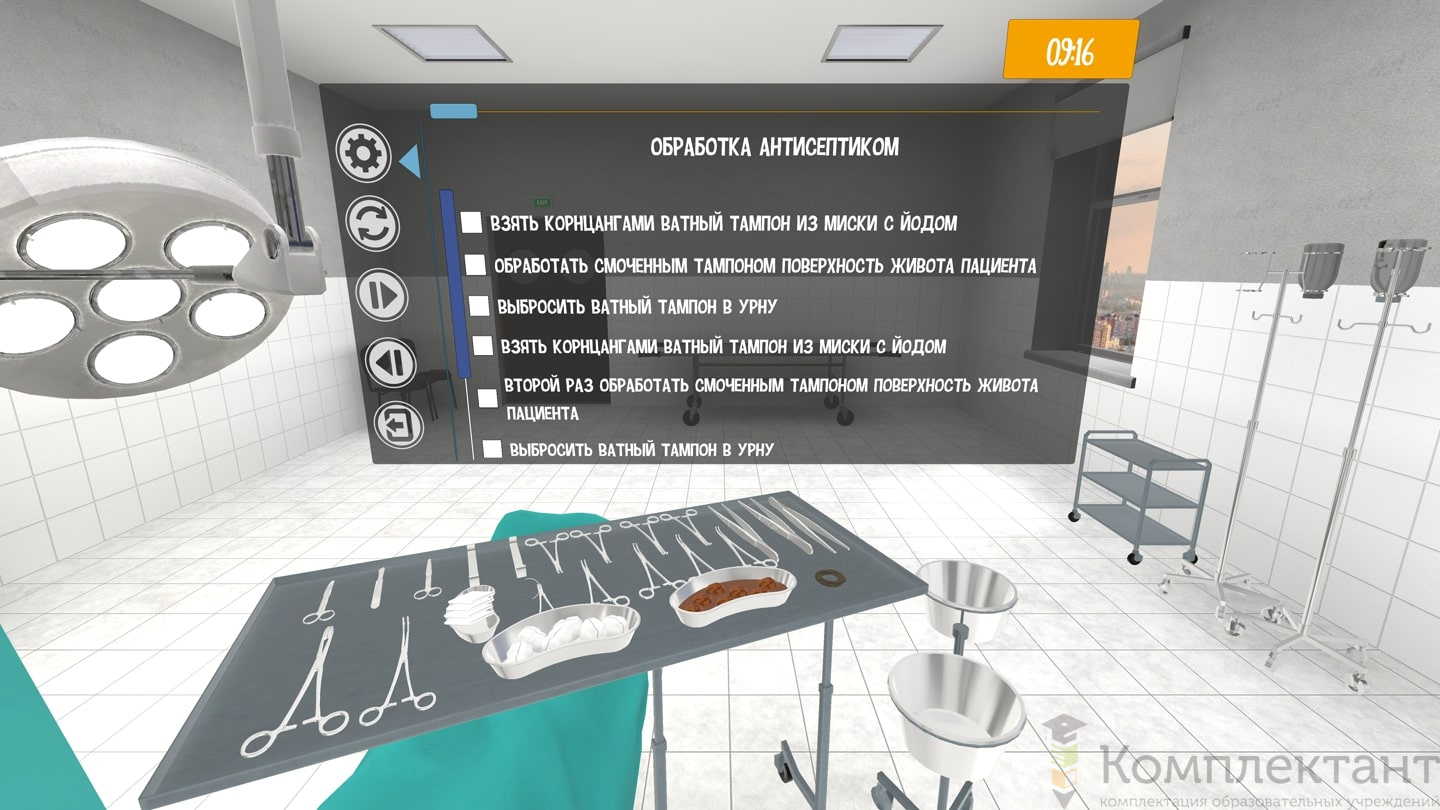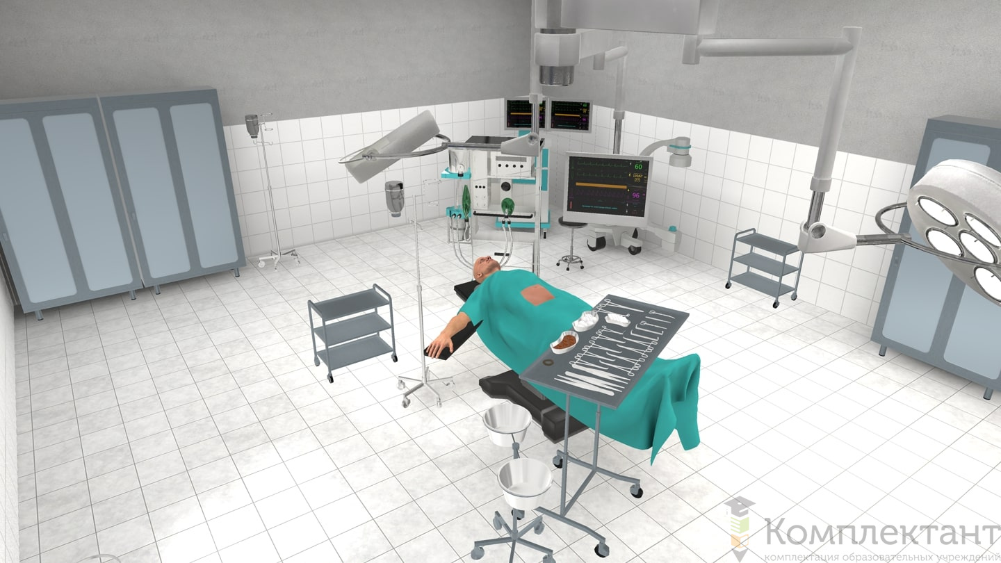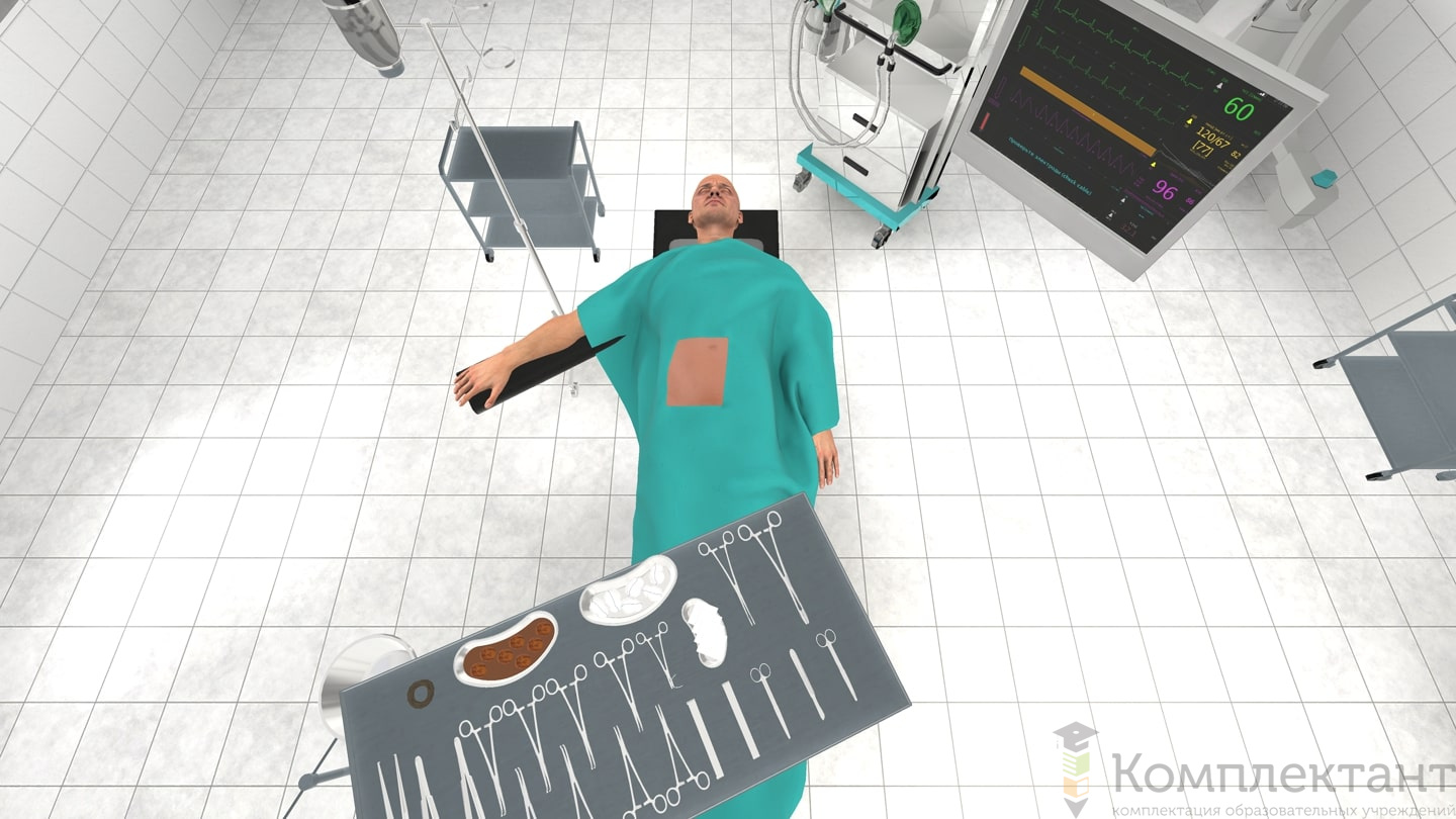 Виртуальный (VR) тренажер «Хирургическая операция Аппендэктомия» – детальная симуляция операции по вырезанию аппендицита. Проведение аппендэктомии требует помощи ассистентов. В приложении роль ассистентов выполняют виртуальные руки, выполняющие вспомогательные действия, например, придержать инструмент, убрать инструменты, сброс мусора в урну.