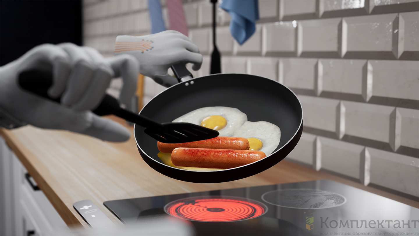Виртуальный (VR) тренажер «Виртуальная кухня» — безопасный симулятор объектов, которые окружают нас в обычной жизни каждый день. Приложение имеет широкий круг возможностей и предлагает пользователю взаимодействовать со множеством предметов, находящихся в кухне различными способами.