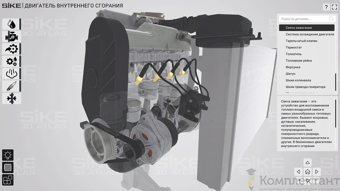 3D Атлас «Устройство двигателя внутреннего сгорания» дает возможность пользователю детально изучить устройства оборудования на базе реалистичных 3D моделей. В основе изучения интерактивные 3D модели реального производственного оборудования. В режиме «обучение» пользователь может вращать модель, скрывать отдельные детали, изучать внутреннее устройство, описание и назначение деталей. В режиме «тестирование» пользователь может проверить свой уровень знаний по конструкции оборудования.