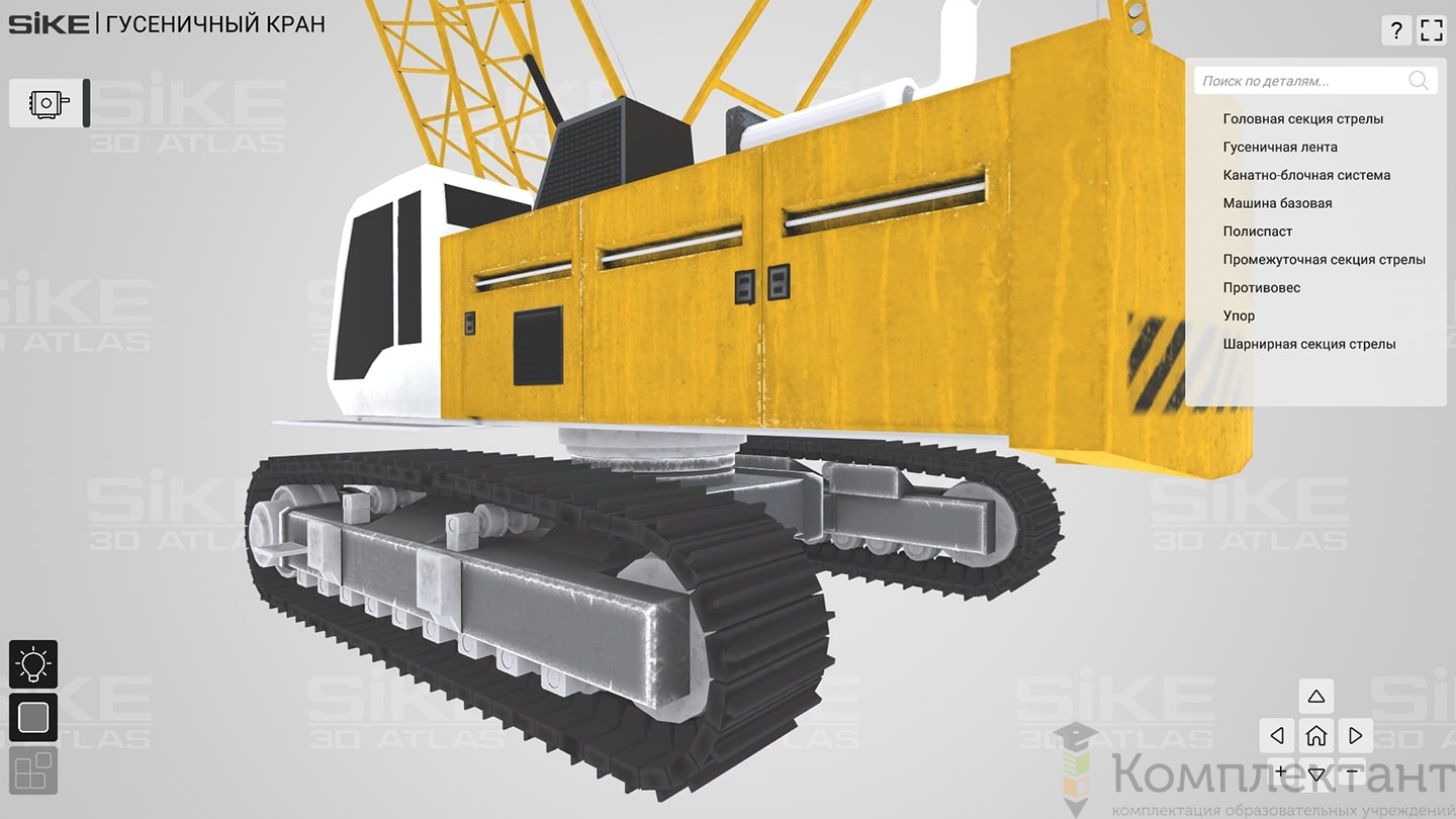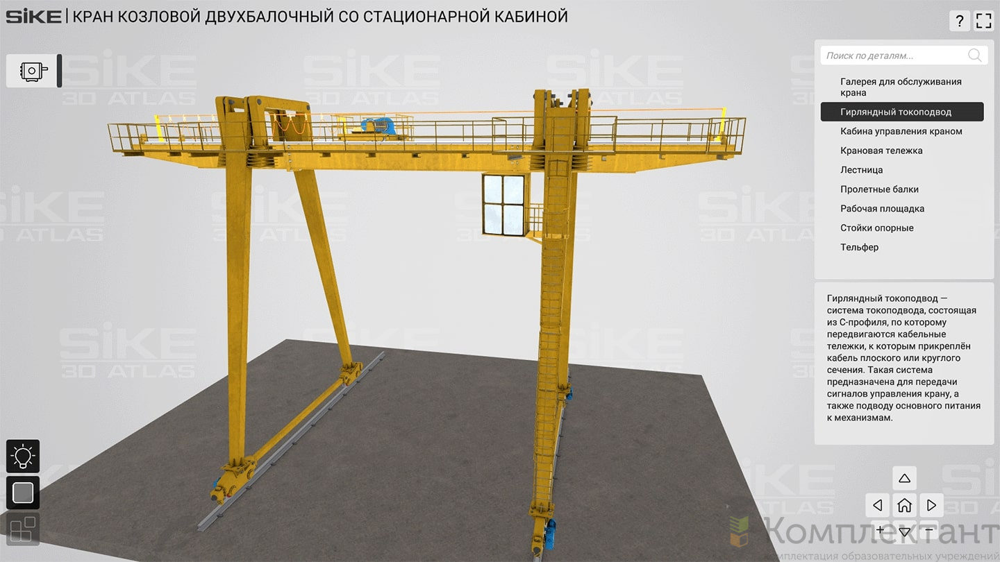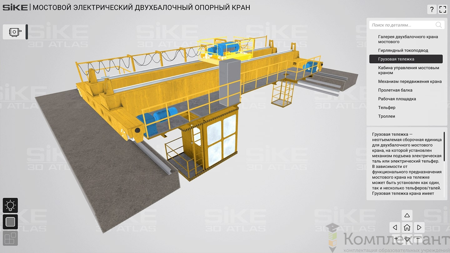 3D Атлас «Устройство грузоподъемных механизмов» дает возможность пользователю детально изучить устройства оборудования на базе реалистичных 3D моделей. В основе изучения интерактивные 3D модели реального производственного оборудования. В режиме «обучение» пользователь может вращать модель, скрывать отдельные детали, изучать внутреннее устройство, описание и назначение деталей. В режиме «тестирование» пользователь может проверить свой уровень знаний по конструкции оборудования.