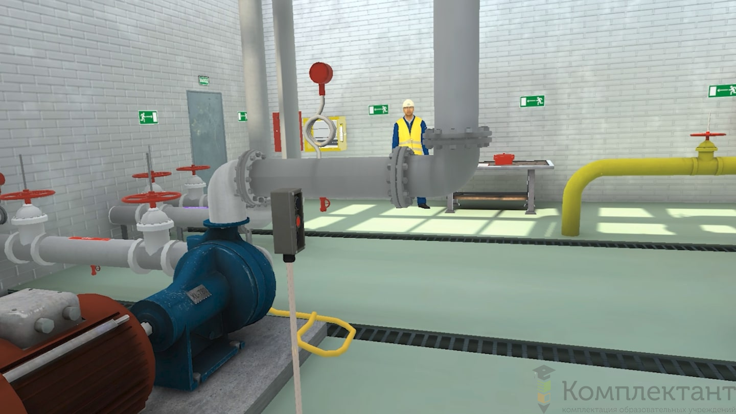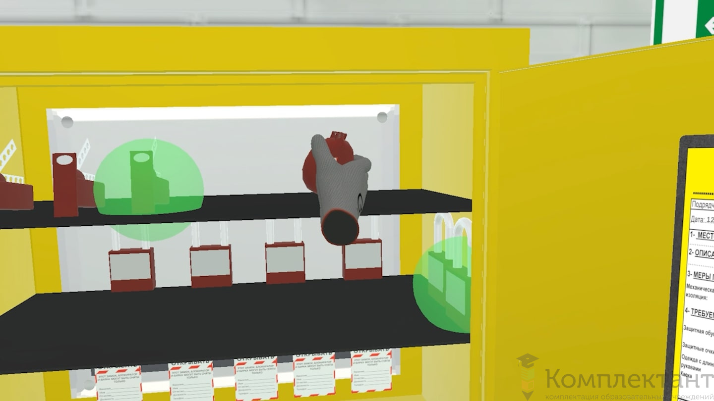 Виртуальный (VR) тренажер «Маркировка-блокировка» воссоздает ситуацию проведения процедуры блокировки-маркировки. В процессе которой пользователю необходимо временно изолировать оборудование от всех источников энергии и обеспечить такое обесточенное состояние, пока продолжается техобслуживание машины. В симуляции обучающийся должен провести физическую изоляцию электрической и гидравлической опасной энергии в соответствующем оборудовании при помощи инструментов процедуры блокировки-маркировки, а именно: установки блокираторов на систему, далее замка с индивидуальным ключом для пользователя и установки ярлыка маркировки с подписью, датой и указанием проводимых работ.