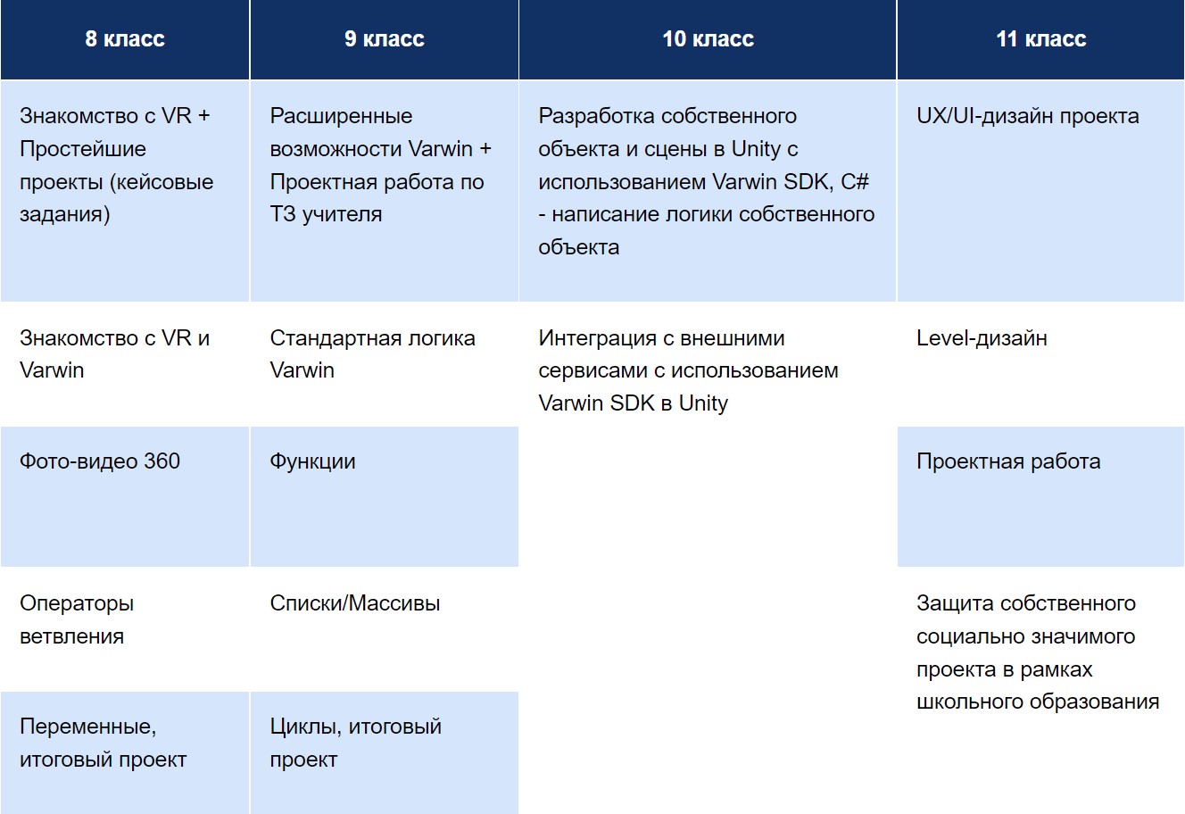 На базе Varwin Education может быть реализована образовательная вертикаль по VR-разработке с 8 по 11 класс в рамках дополнительного и общего среднего образования.